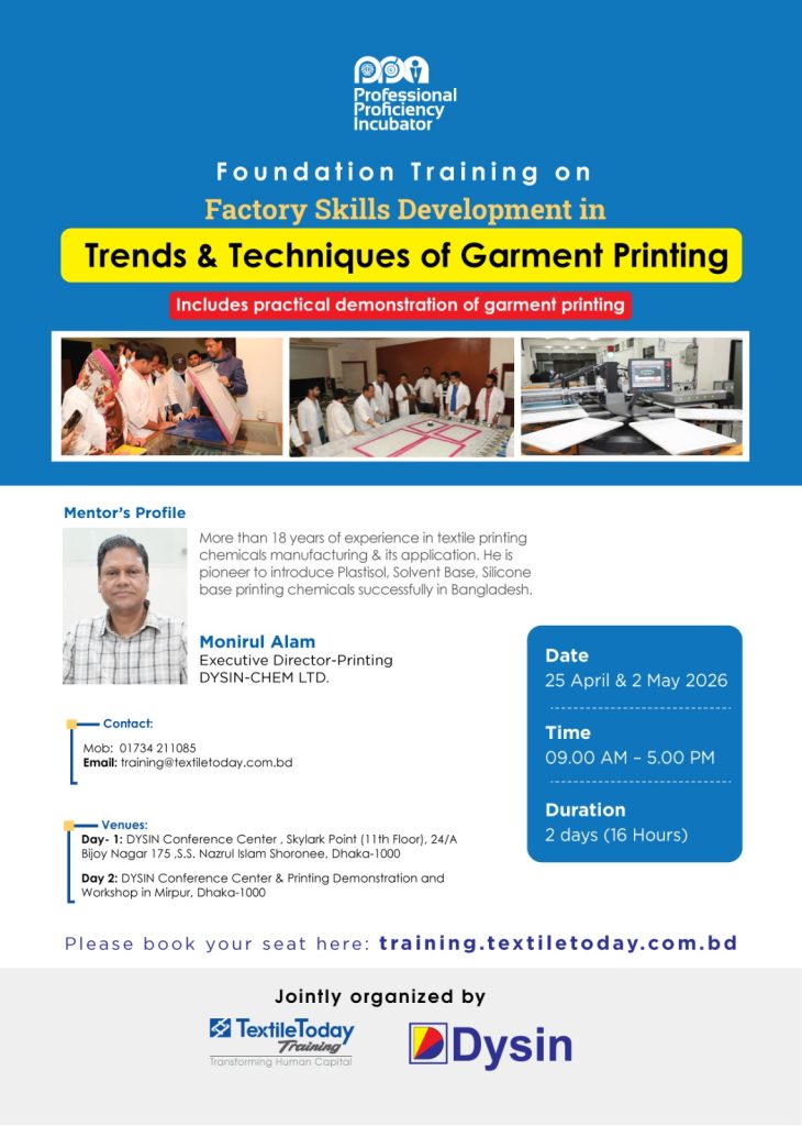 Textile Today and DYSIN is jointly offering the intensive 2 days (16 hours) long Professional Proficiency Incubator (PPI) training on ‘Trends & Techniques in Garments Printing’ for professionals working in the Textile & Garment printing industry. This training will support to the garments printing manufacturers & its related personnel to get hands on experience on garment printing process, technique & new scopes in Bangladesh.